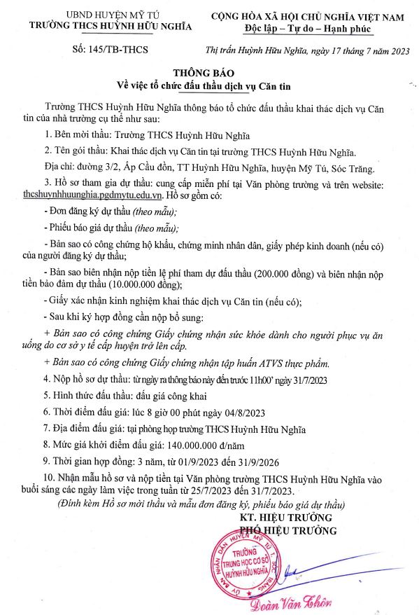 Trường THCS Huỳnh Hữu Nghĩa thông báo mời thầu Căn tin 2023